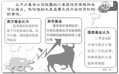 就在公募基金一致唱多了一个季度的大盘蓝筹股表现平平之后,不少公司开始披露二季度投资策略报告,低估值的大盘蓝筹正成为各投资机构的首选。