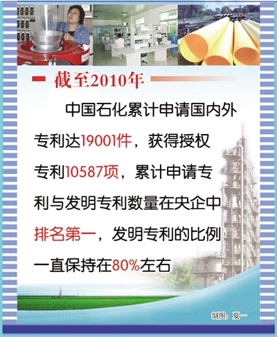 这仅是中国石化以科技创新驱动发展的一个缩影。截至2010年,中国石化累计申请国内外专利达19001件,获得授权专利10587项,其中向55个国家申请国外专利1584项,获得授权专利742件,累计申请专利与发明专利数量在央企中排名第一,发明专利的比例一直保持在80%左右。