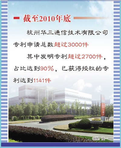 据统计,截至2010年底,杭州华三通信技术有限公司专利申请总数超过3000件,其中发明专利超过2700件,占比达到90%,已获得授权的专利达到1141件。