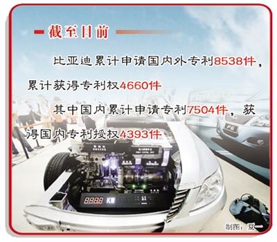 比亚迪在实施垂直整合战略的过程中,积累了一大批技术创新成果,进而转化为数量可观的自主知识产权。据比亚迪知识产权部经理赵杰介绍,截至目前比亚迪累计申请国内外专利8538件,累计获得专利权4660件,其中国内累计申请专利7504件,获得国内专利授权4393件。2007年以来,比亚迪的专利申请量特别是发明专利申请量,在国内企业排名中名列前茅。2010年发明专利授权量排名前10位的内地企业中,比亚迪以395件发明专利排名第七。