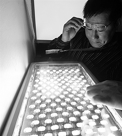 以风力发电、光伏太阳能发电、电动车、LED照明等为代表的新能源产业已经逐渐成为浙江数千亿民营资本重点投资的领域。图为一位参展商在杭州举办的清洁能源与环保产业展览会期间察看浙江一家LED照明灯生产企业展出的产品。 新华社记者 黄宗治摄