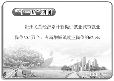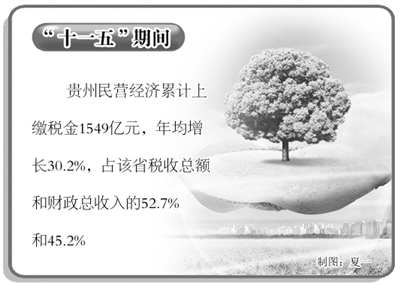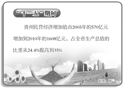 “十一五”期间,贵州省着力营造良好环境,民营经济取得长足发展,已经成为经济社会的重要支撑、财政收入的重要来源、增加就业的重要渠道和扩大投资的重要渠道。贵州省相关部门数据显示:该省民营经济增加值由2005年的570亿元增加到去年的1608亿元,占全省生产总值的比重从24.4%提高到35%;“十一五”期间累计上缴税金1549亿元,年均增长30.2%,占该省税收总额和财政总收入的52.7%和45.2%;累计新提供城镇就业岗位60.1万个,占新增城镇就业岗位的62.9%;累计投资5007亿元,其中去年投资1551亿元,是2005年的3.4倍,占全社会固定资产投资的比重达到48.7%。