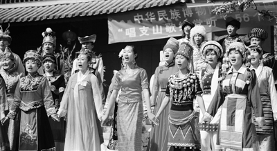 4月29日,北京中华民族园,身着盛装的青年人正放声高歌。 “五一”节临近,北京市各大公园纷纷组织红歌会、赏花节等活动,受到了广大游客的欢迎。 本报记者 赵 晶摄