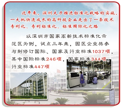 在深圳,一大批快速成长的高科技企业在经历国际市场竞争的历练之后,较早地认识到这一点,走出了一条技术专利化、专利标准化、标准国际化之路。仅在深圳市国家高新技术标准化示范区,试点三年来,园区企业共参与制修订国际、国家及行业标准1037项,其中国际标准246项,国家标准344项,行业标准447项,产生了一批自主创新的技术标准成果。