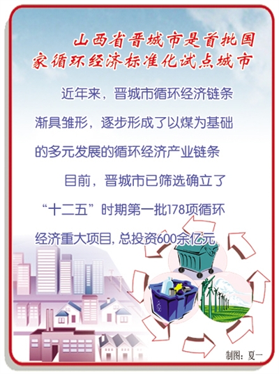 晋城是全国无烟煤基地和首批国家循环经济标准化试点城市。“十一五”时期,通过“煤转肥、煤转化、煤转电”,晋城市逐步形成了以煤为基础的多元发展的循环经济产业链条,涌现出一批基本成型的循环型企业,成为山西省潜力较大的发展循环经济的地区之一。山西省委书记袁纯清指出,“晋城要把循环经济这张牌打好,建成循环经济的先行示范区。”晋城市市长王清宪告诉记者,“我们要把循环经济作为实现转型跨越发展的基本路径,改造提升传统产业的主要手段,新产业、新项目的准入门槛,资源优先配置的优先领域来大力发展。”