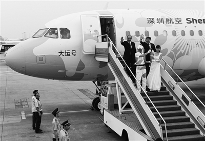 5月4日,两名深圳第26届世界大学生夏季运动会志愿者手提火种灯走出机舱。 蔡伟光摄