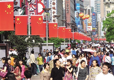 左图 5月1日,游客在上海城隍庙购物观光。“五一”期间,上海4000多家商业网点共实现营业收入约35亿元,同比增长20.3%。