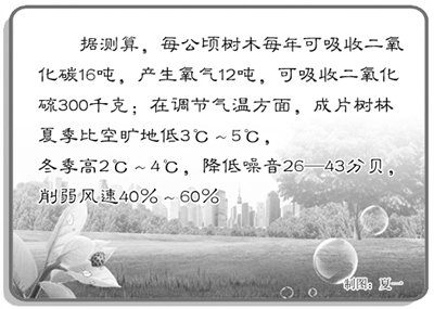 树木,特别是大型的乔木是城市绿化的骨架。据测算,每公顷树木每年可吸收二氧化碳16吨,产生氧气12吨,可吸收二氧化硫300千克;在调节气温方面,成片树林夏季比空旷地低3℃~5℃,冬季高2℃~4℃,降低噪音26—43分贝,削弱风速40%~60%。