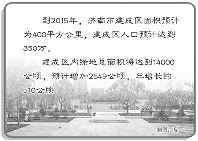 到2015年,济南市建成区面积预计为400平方公里,建成区人口预计达到350万。建成区内绿地总面积将达到14000公顷。其中,公园绿地总面积达到3570公顷,增加615公顷,年增长约123公顷。争取到2015年,济南市建成区绿化覆盖率、绿地率和人均公园绿地面积分别达到40%、35%和10.2平方米。