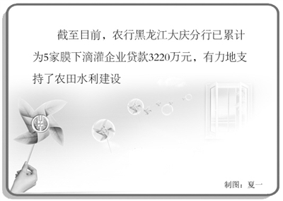 膜下滴灌技术是一种结合了以色列滴灌技术和国内覆膜技术优点的新型节水技术。2008年,为进一步提高农业生产能力,大庆市引进了膜下滴灌抗旱技术。为有力支持膜下滴灌事业的发展,农行大庆分行积极介入,选择了生产实力强、规模大的5家企业作为重点扶持对象。2010年为金土地农业科技有限公司、原生农业科技有限公司分别贷款500万元和400万元。2011年,在为以上两户企业续授信840万元的同时,又为红阳天雨农业科技有限公司、凯农业技术发展有限公司、三鑫农业科技发展有限公司授信1480万元。截至目前,该行已累计为5家膜下滴灌企业贷款3220万元,有力地支持了该项目的发展。