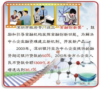 在金融监管部门支持下,深圳市专门设立“金融创新奖”,鼓励和引导金融机构发挥金融创新功能,为解决中小企业融资难建立新机制、开发新产品。中国建设银行深圳市分行公司银行部副总经理尹小雄介绍,他们以模式创新为先导,以产品创新为突破,相继推出了应付账款融资、保付仓、厂商银、联贷联保、会员制担保公司、互保金等创新产品,受到客户的欢迎,走出了一条服务中小企业发展的新路子。