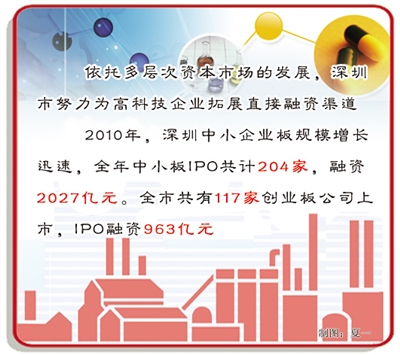 依托多层次资本市场的发展,深圳市努力为高科技企业拓展直接融资渠道。2010年,深圳中小企业板规模增长迅速,全年中小板IPO共计204家,融资2027亿元。全市共有117家创业板公司上市,IPO融资963亿元。截至2010年末,全市创业板上市公司共153家,累计成交1.57万亿元。而代办股份转让试点于2006年1月开始,5年多来共有74家企业挂牌,其中久其软件成功转板中小板,北陆药业成功转板创业板。