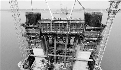 5月5日,中铁大桥局五公司的施工人员在湖北黄冈长江大桥南主塔施工现场浇筑下横梁。 黄冈长江大桥是新建武汉至黄冈城际铁路及黄冈至鄂州高速公路的重点控制性工程,于2010年3月1日正式开工,预计2014年建成。大桥建成后,将真正实现黄冈与武汉从公路、铁路及轨道交通方面全方位的“无缝对接”。 新华社发