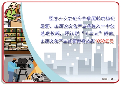 据介绍,新组建的山西五大文化企业集团涵盖网络、演艺、传媒、报业、影视等文化产业核心层的多个领域。山西广电信息网络集团将分散运营的100多张有线电视局域网进行整合,实现由“看”电视到“用”电视,单一视频业务变综合信息服务的转变;山西日报传媒集团剥离发行、印刷、广告等经营性资产,力争“十二五”末形成总资产10亿元,总收入8亿元的大型立体化传媒集团;山西广电传媒集团力争3至5年上市;山西演艺集团通过改革促进数家骨干演出单位实现演艺与旅游等现代服务业融合发展;山西影视集团5年内将打造成为年生产电影20部、电视剧500集以上的大型国有影视生产企业。上述五大文化企业集团加上先期转企的山西出版传媒集团,这六大文化企业集团已具备了与国内外大型文化企业竞争的实力和巨大的发展潜力,标志着山西文化产业进入集约化、规模化、专业化发展的新阶段。今后,通过六大文化企业集团的市场化运营,山西的文化产业必将进入一个快速成长期,预计到“十二五”期末,山西文化产业经营额将达到1000亿元。
