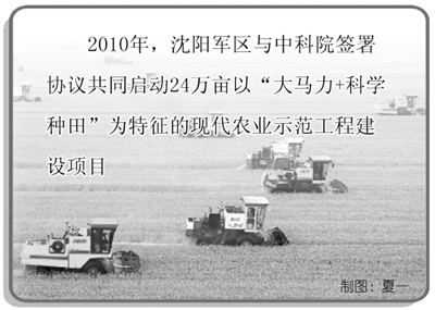 沈阳军区联勤部副部长刘志明告诉记者,“依托中国科学院的科技支撑,通过大马力机械化耕作,一批农业高新科技将在军区农副业基地得到全面试验应用,这将给我国农业现代化、集约化生产提供有益借鉴。”
