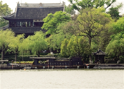 下图 这是停泊在嘉兴南湖湖心岛烟雨楼前的红船(4月19日摄)。