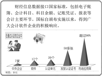 从会上通报的信息显示:作为会计标准化战略的重要工作之一,会计核算软件数据接口国家标准实施近1年来,共有7家企业的17款软件获得认证。国家标准委累计发放了50多张认证证书,标准化产品市场应用率超过90%。这说明我国审计信息标准化取得了突破性成果,已经基本实现了国家审计与企事业财务信息的无缝对接。