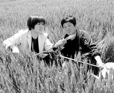5月12日,河北省邯郸市曲周县农牧局技术站农艺师杨玉芳(左)在田间为农民传授小麦管理技术。目前,邯郸市农业局组织100名农业专家,带动1000名农业技术员,指导农民做好小麦田间管理工作。 李志忠摄(新华社发)