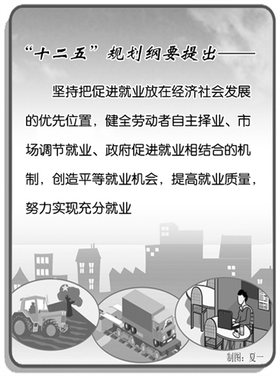 “十二五”规划纲要提出,坚持把促进就业放在经济社会发展的优先位置,健全劳动者自主择业、市场调节就业、政府促进就业相结合的机制,创造平等就业机会,提高就业质量,努力实现充分就业。