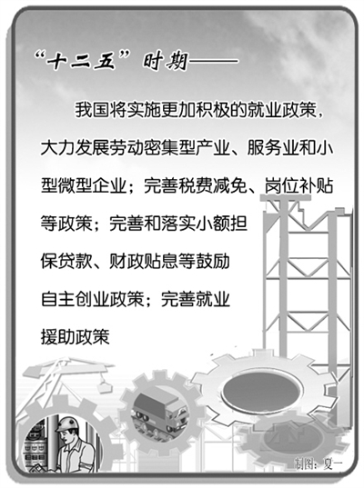 实施就业优先战略,“十二五”时期我国将实施更加积极的就业政策,大力发展劳动密集型产业、服务业和小型微型企业,千方百计扩大就业创业规模;完善税费减免、岗位补贴、培训补贴、社会保险补贴、技能鉴定补贴等政策,促进高校毕业生、农村转移劳动力、城镇就业困难人员就业;完善和落实小额担保贷款、财政贴息、场地安排等鼓励自主创业政策,促进各类群体创业带动就业;建立健全政府投资和重大项目建设带动就业机制;完善就业援助政策,多渠道开发公益性岗位;鼓励开展对外劳务合作。