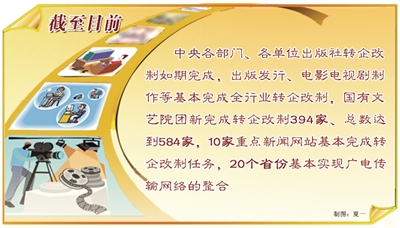 如果说2009年是众多关键问题破题的一年,2010年就是先行者示范效应开始显现的一年。先走一步的企业经过一年的调整和发展,改革的成效逐步显现,后继者因此增强了发展信心,加快了改革步伐。截至目前,中央各部门、各单位出版社转企改制如期完成,出版发行、电影电视剧制作等基本完成全行业转企改制,国有文艺院团新完成转企改制394家、总数达到584家,10家重点新闻网站基本完成转企改制任务,20个省份基本实现广电传输网络的整合。