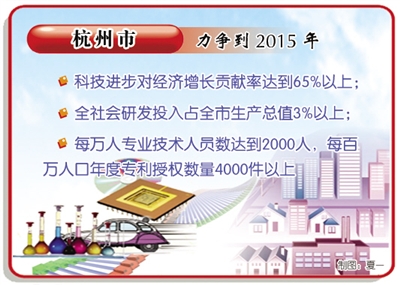 “十二五”开局之年,杭州市又为自己确立了新的目标,力争到2015年,科技进步对经济增长贡献率达到65%以上;全社会研发投入占全市生产总值3%以上;每万人专业技术人员数达到2000人,每百万人口年度专利授权数量4000件以上。