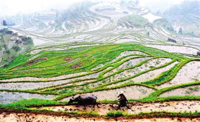 5月16日,浙江省丽水市云和梯田,农民忙着耕作,在晨雾笼罩下,美丽的梯田勾画出一幅生机盎然的田园风光图。被称为“中国最美梯田”的云和梯田距今有1000多年的历史,总面积51平方公里,跨越高山、丘陵、谷地三个地质景观带,是华东地区最大的梯田群。 本报记者 赵 晶摄