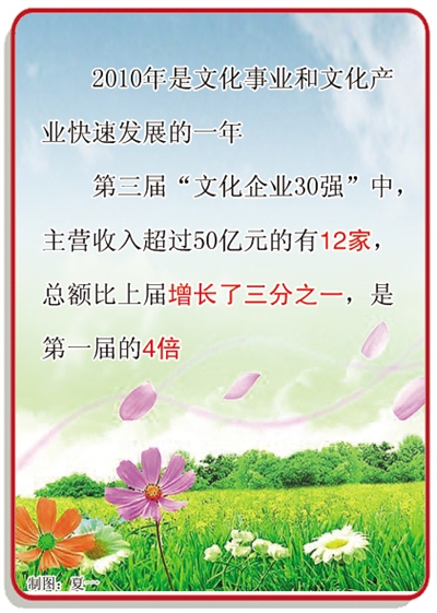 本届获选的“文化企业30强”中,主营收入超过50亿元的有12家,总额比上届增长了三分之一,是第一届的4倍。