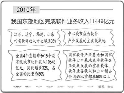 据介绍,2010年,我国东部地区完成软件业务收入11449亿元,江苏、辽宁、福建、山东四省软件收入增长超过35%。中心城市成为软件产业发展的主要聚集地,4个直辖市和15个副省级城市软件收入10643亿元,同比增长32%,占全国的比重为80%。国家软件产业基地和国家软件出口基地成为软件企业聚集发展的重要载体,软件业务收入和出口额占全国的比重都在50%以上。