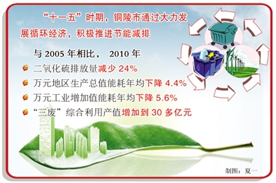 “十一五”时期,铜陵市通过大力发展循环经济,积极推进节能减排。与2005年相比,2010年二氧化硫排放量减少24%,万元地区生产总值能耗年均下降4.4%;万元工业增加值能耗年均下降5.6%。“三废”综合利用产值由2005年的3亿元增加到2010年的30多亿元。全市综合利用余热余压发电近24亿千瓦时。