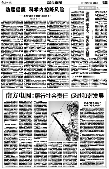2010年,广东、云南、贵州电网公司在多项客户满意度调查中排名首位;南方电网全网供电可靠率99.924%;网内城市客户平均停电时间减少274分钟;与2005年相比,带动上下游节能折合减排二氧化碳10217.7万吨;农村无电户通电3万户;公司在世界500强企业排名156位……5月20日,随着南方电网公司《2010年企业社会责任报告》和《2010年绿色发展报告》的发布,一个责任南网、绿色南网、和谐南网的企业形象凸显在社会大众面前。