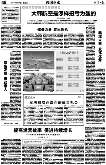 2008年国际金融危机蔓延,以客货运输为主业的航空公司首当其冲。一般而言,收缩是主要应对方针,但大韩航空却采取了扩充策略。2009年,当其他航空公司纷纷把头等舱和商务舱的座位换成经济舱以增加载客量之际,大韩航空斥资2亿美元,将其广体客机的头等舱和商务舱的座椅升级,更换机舱内的娱乐设施,同时签署了3亿美元的客机新引擎购买订单。到了今年一季度,大韩航空国际航线运力和载客量均有明显提高。由此可见,大韩航空的危机应对策略颇有远见。