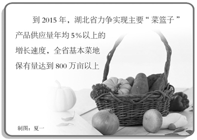 湖北省委书记李鸿忠表示,未来5年内,湖北将力争实现主要“菜篮子”产品供应量年均5%以上的增长速度;全省基本菜地保有量达到800万亩以上;规模化、标准化基地生产的“菜篮子”产品成为全省蔬菜产品主要来源;全省从业农民人均纯收入增长10%以上;发挥区位、生产和科技支撑优势,使湖北成为全国重要的“菜篮子”生产基地。