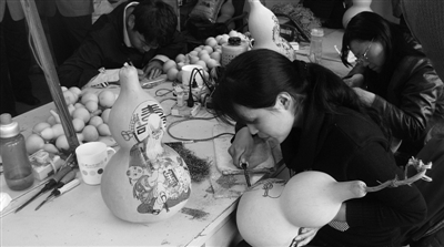 图1:福禄缘葫芦工艺制品有限公司的工人正在用电烙铁给葫芦烙画。