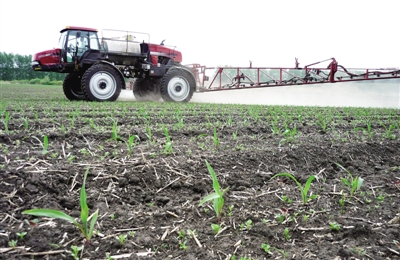 当前,黑龙江垦区1018.6万亩玉米苗势喜人。垦区每天投入百余台带有GPS卫星导航系统的新型喷药机对玉米进行苗期管理,确保增产增收。 周良君摄(新华社发)