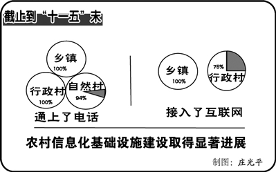 根据公开的数字,截止到“十一五”期末,我国已有100%的乡镇、100%的行政村、94%的自然村(20户以上)通了电话,其中,100%的乡镇、75%的行政村接入了互联网,已实现“村村通电话、乡乡能上网”,农村信息化基础设施建设取得显著发展。这些年,电信运营商在农村的通信建设上投入很大。其中,中国联通在“十一五”期间累计投资35.5亿元,共完成1.4431万个村通任务,其中包括1.2299万个自然村、1861个行政村以及271个兵团林场的村通任务,超额17%完成工业和信息化部下达的任务。“在‘十二五’期间,我们将不断探索利用3G、物联网和云计算等先进的通信技术手段,推进多种信息化应用,服务现代农业。”中国联通集团副总经理邵广禄表示。
