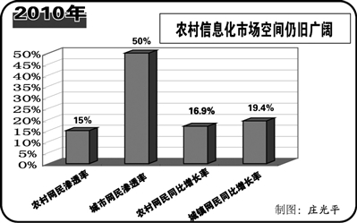 在取得可喜成绩的同时,我们还是要正视,2010年,我国农村网民在农村总人口渗透率仅超过15%,远低于我国城镇网民接近50%的渗透率;而农村网民同比增长16.9%,也低于城镇网民的19.4%。有专家认为,这一组数据一方面说明农村信息化市场空间仍旧广阔,另一方面说明农村网民出现的这种增长瓶颈,对进一步提升农村信息化服务水平、带动农村信息化应用升级提出了迫切的需求。对此,业内人士纷纷表示,我国的农村信息化应用应该由通信服务向信息服务升级。