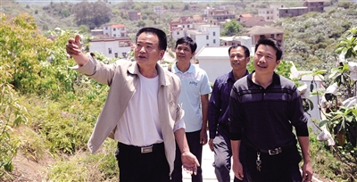 下图 洋边村党支部书记郭炳星(左),父辈就在莆田老区干革命。郭炳星经常与村干部们满村、满坡地转,完善规划,研究新的目标,力争让“枇杷经济”带动全村全面发展。