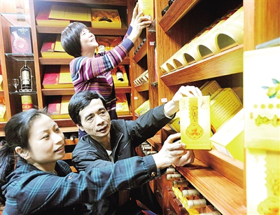 右上图 洋边村党支部、村委会几年来积极为果农沟通联营渠道,除应季多销枇杷鲜果外,还大力发展枇杷深加工,制成枇杷酒、枇杷膏等产品,源源销往国内外。