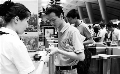 6月1日,在北京南站,乘客持身份证和车票进站。6月1日起,铁路动车组列车实行实名制管理,乘坐动车组列车的旅客须凭本人有效身份证件购买车票进站乘车。 本报记者 赵 晶摄