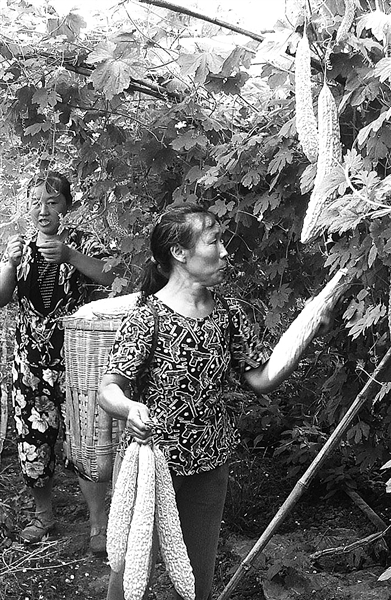 左图 四川省眉山市彭山县锦江乡正华村菜农在采摘苦瓜。