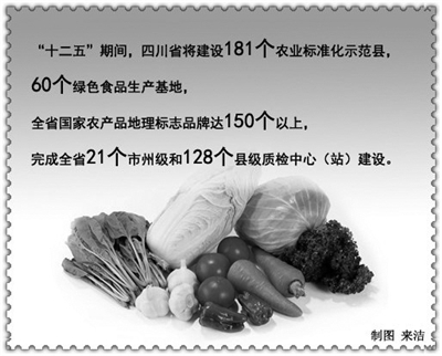 据悉,“十二五”时期,四川省将建设181个农业标准化示范县,60个绿色食品生产基地,使全省国家农产品地理标志品牌达150个以上,完成全省21个市州级和128个县级质检中心(站)建设,形成高效的农产品质检体系,确保全省“菜篮子”的安全。