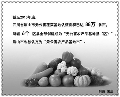 “近几年在全国历次监测中,眉山蔬菜农药残留合格率均达到100%。”眉山市农业局局长王志敏说,截至目前,眉山蔬菜产业共有70个绿色食品,24个无公害农产品,7个四川省著名商标和四川名牌农产品7个,5个中国驰名商标。截至2010年底,眉山市无公害蔬菜基地认证面积已达88万多亩,所辖6个区县全部创建成为“无公害农产品基地县(区)”,眉山市也被认定为“无公害农产品基地市”。