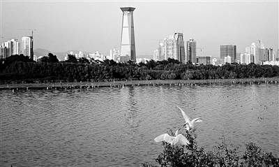 福田区鳞次栉比的高层商业楼宇,正是这些总部经济和现代服务业的聚集地。福田区区长张青山介绍说,福田现有20层以上的商业楼宇398栋,其中,单栋年税收上亿元的有50栋。在2010年,全区实现税收515亿元,而这50栋高层楼宇的总税收高达314亿元,占61%。而与此相对应的是,2010年,福田区万元地区生产总值建设用地3.09平方米,同比下降9.6%;万元地区生产总值水耗9.13吨,同比下降12.3%,仅为深圳全市平均水平的45%;万元地区生产总值电耗340千瓦时,同比下降7.9%。