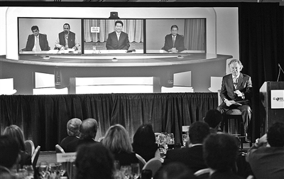上图 不久前在美国旧金山举行的“21世纪全球绿色城市研讨会”上,身处世界不同地点的主讲人通过网络视频发言。 刘艺霖摄(新华社发)