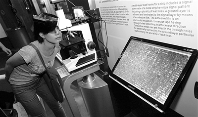 上图:市民正在上海张江集成电路科技馆通过显微镜观察“上海制造”的微型芯片。