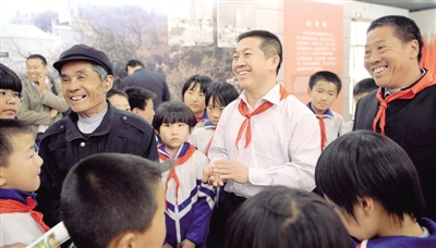 上图 不久前,3名致富带头人(从左至右)张锡祥(1956年入党,担任村党支部书记28年)、张来印(1988年入党)、张红印(1987年入党)来到狼牙山五壮士纪念馆,向狼牙山东西水小学的师生讲述革命传统、展望美好未来。