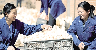 左上图 易县易州镇石亢村养殖基地,员工黄映(左)和王红丽正在分拣新鲜鸡蛋。该养殖基地年出售鸡蛋的收入数万元。