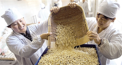 左下图 河北狼牙山农产品有限公司的员工正在加工玉米。该公司安排当地农民生产杂粮、山货、干果、野菜等200多个品种,在全国开设20多家连锁店销售。
