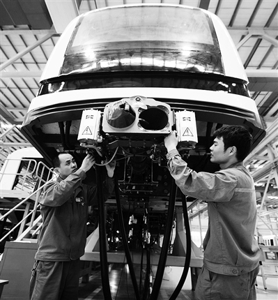4月26日,中国南车集团株洲电力机车有限公司技术人员在总装车间内组装一列出口土耳其的城轨列车。